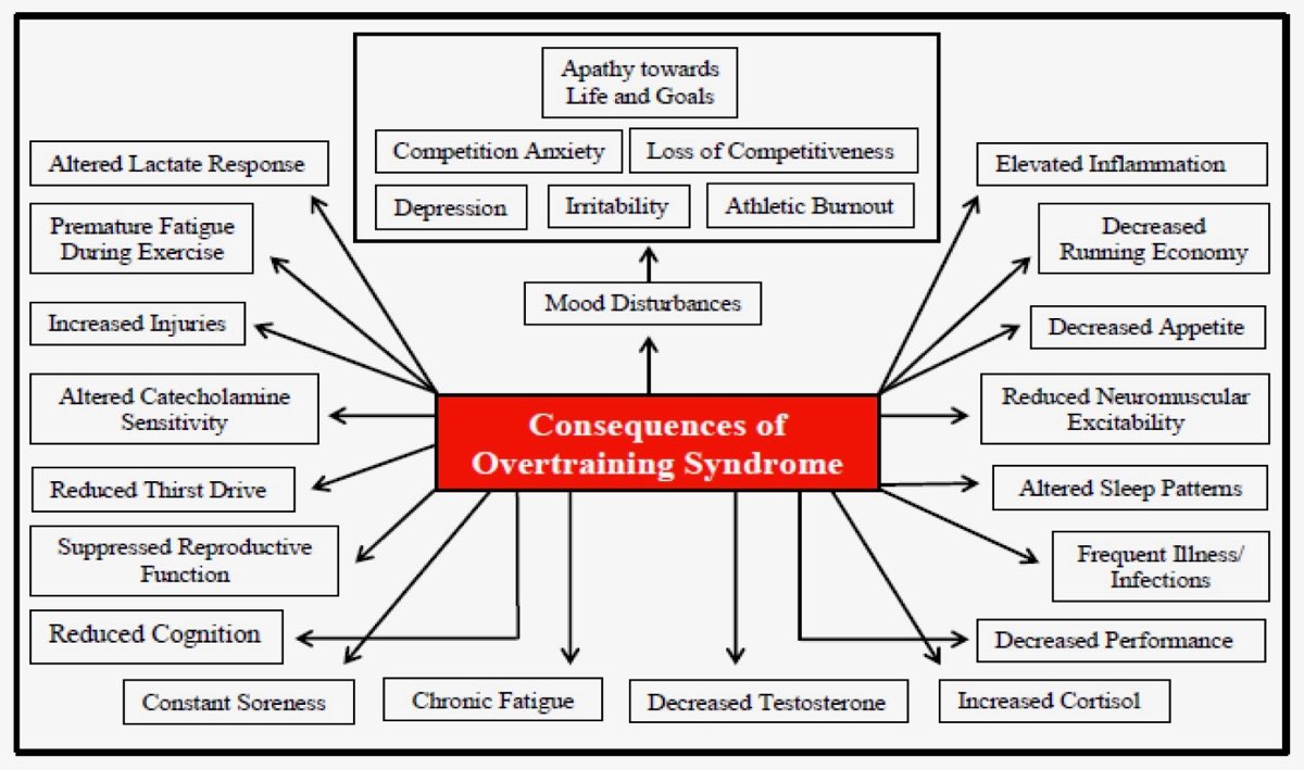 Overtraining also produces several psychological symptoms. These can include either decreased or increased appetite, Sleep disturbances, a feeling of constant fatigue, inability to focus or concentrate; and loss of training motivation. What many bodybuilders and athletes often overlook is that the muscles grow during rest and recuperative periods, not during training. Without sufficient rest between training sessions, overtraining can rapidly ensue.
